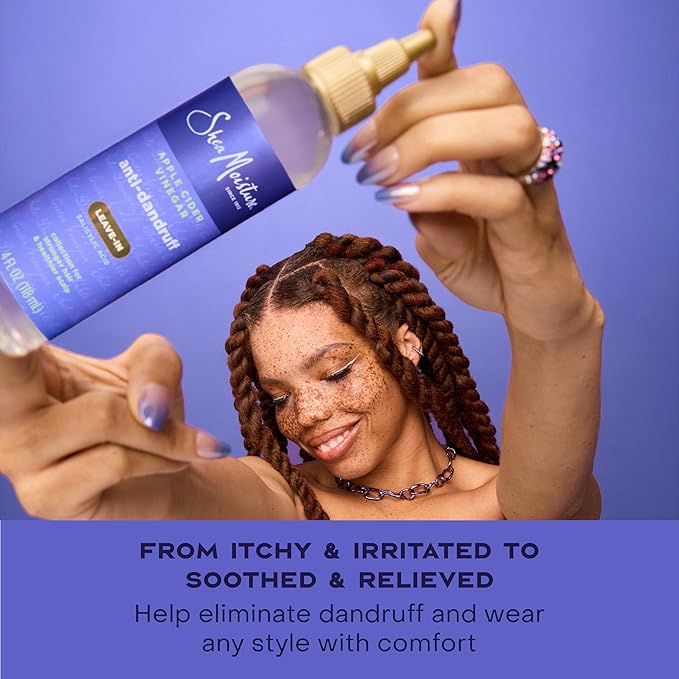 - BREAK THE DANDRUFF CYCLE It’s time to lose the dandruff and soothe your scalp with SheaMoisture Apple Cider Vinegar Anti-Dandruff Leave-In. Reach for it to style without the flakes, itch or irritation