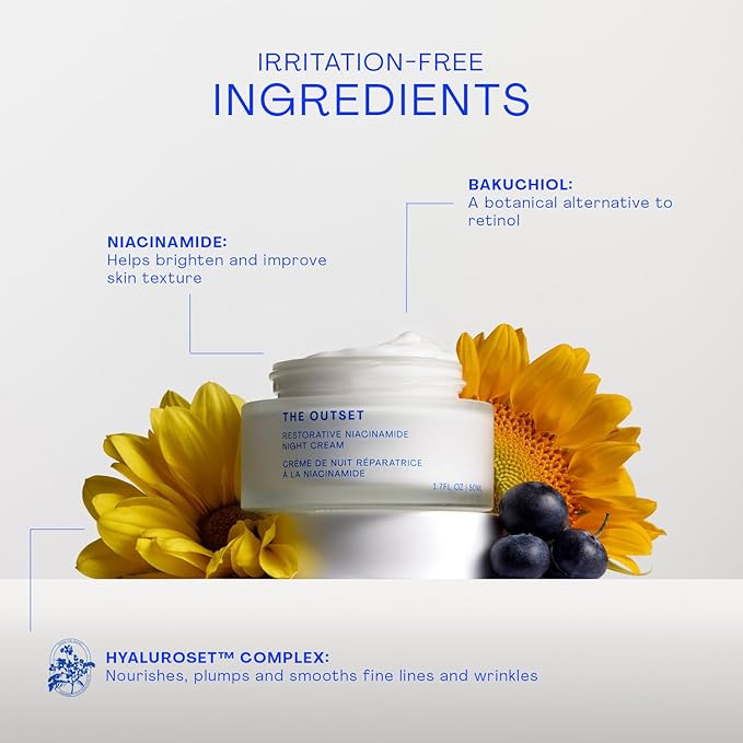 The Outset Restorative Niacinimide and Bakuchiol Night Cream - Gentle Fragrance Free Anti-Aging Moisturizer - Wrinkle reducing - Clean, Vegan, Gluten Free - All Skin Types, Sensitive Skin - 1.7 fl oz