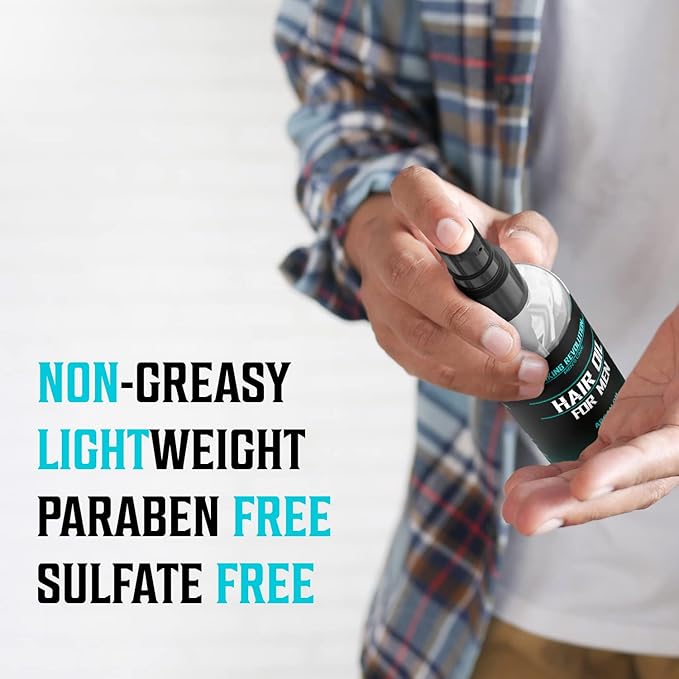 - Hair Oil for Men Keeps Hair Moisturized - Use the mens hair oil daily to keep every strand healthy and hydrated. Avoid dry, dull, and damaged hair with this hydrating oil that will leave your luscious locks looking smooth and naturally shiny.