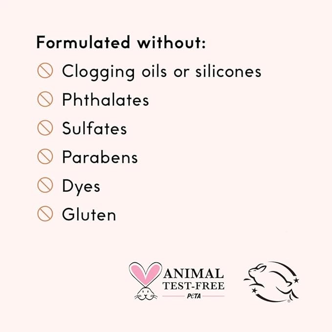 - Formulated Without: Sulfates, silicones, phthalates, parabens, dyes, pore-clogging oils, and formaldehyde-releasing preservatives. Gluten free. Vegan. Cruelty-Free. Not intentionally added. While we intentionally avoid certain ingredients, we cannot always eliminate trace or low levels of impurities, residuals, or processing aids. We work closely with our trusted partners and suppliers to minimize these as much as possible through thoughtful formulation, testing, and quality controls.