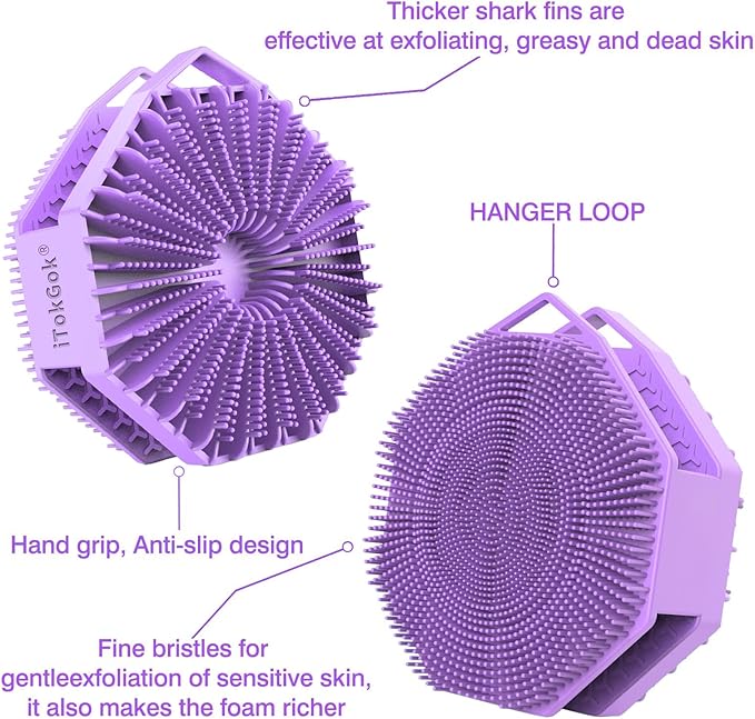 - Dual-sided Design:iTokGok Silicone Body Scrubber features two sides - one side with fine bristles for gentle of All skin and Lathers Well, and the other side with Scrubbing fins for exfoliation and thorough cleansing.