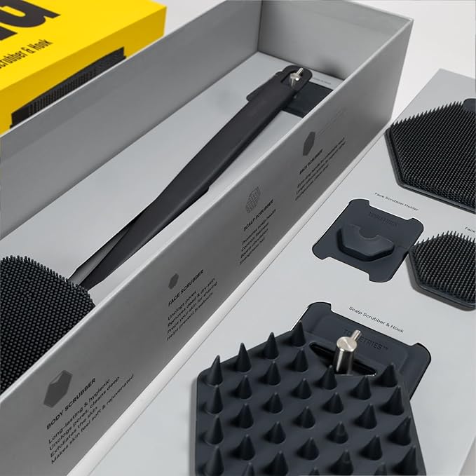 - THE FULL HOUSE - The Scrub King body scrubber set for men includes 1x Back Scrubber, 1x Body Scrubber 2.0, 1x Scalp Massager, 1x Face Scrubber, 3x hooks, and 1x holder for the face scrubber, all conveniently sized for easy storage, installation, and travel
