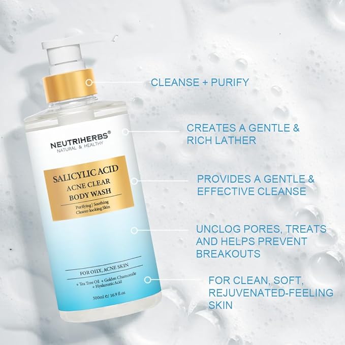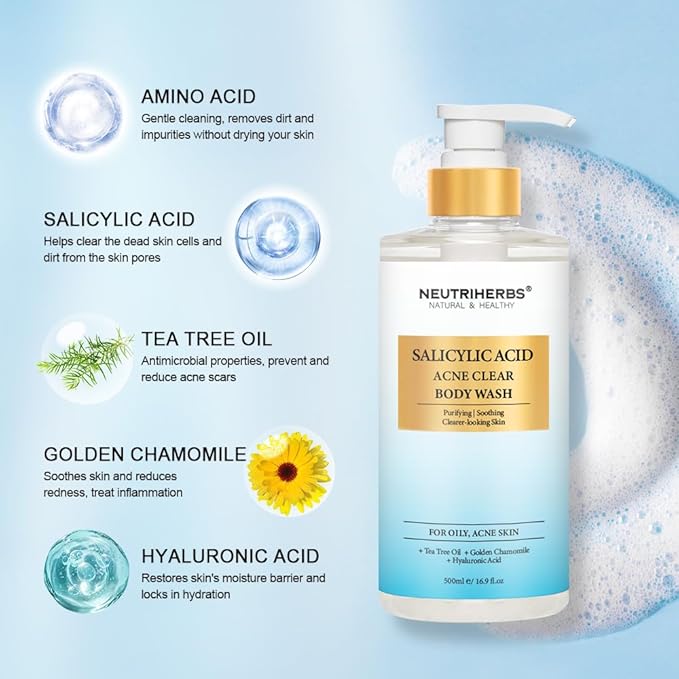 - ššš ššššššš & šššš-šššš - Neutriherbs Salicylic Acid Body Wash is formulated with tea tree oil, salicylic acid, golden chamomile and hyaluronic acid. Effectively remove dead skin cells, reduce redness and acne. Also prevent new breakout on the chest and back.