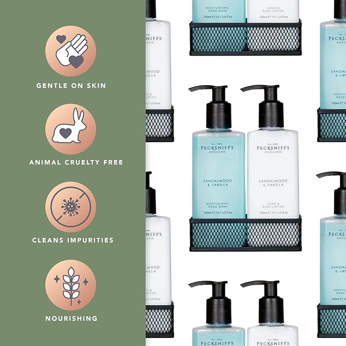 Pecksniff's Kitchen Soap Dispenser Set, Moisturizing Liquid Hand Soap Lotion Set for Kitchen Sink Bathroom Countertop with Black Metal Mesh Caddy, 10.14 Fl oz (Sandalwood and Vanilla)