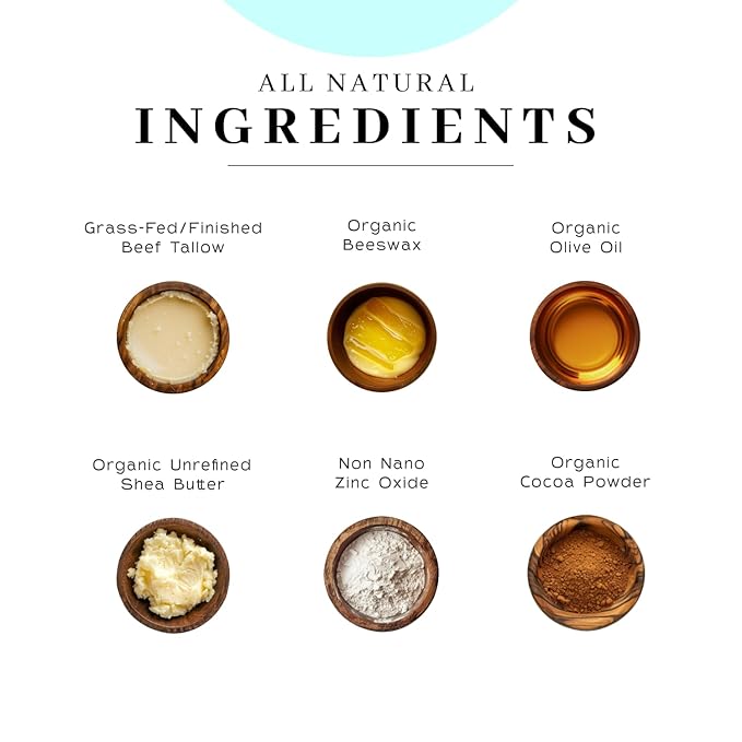 - Skin Loving Ingredients - This zinc sunscreen absorbs quickly and uses pure ingredients; packed with non-nano minerals, grass fed beef tallow, olive oil, beeswax, shea butter, and cocoa powder, it nourishes while caring for your skin