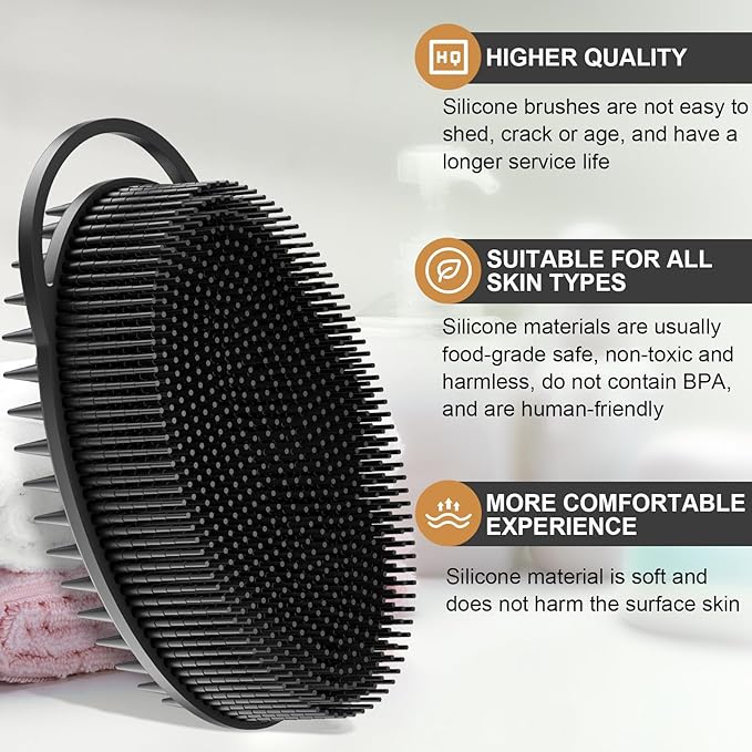 - 2 in 1 Silicone Body Scrubber: One side is a soft, long-bristled brush surface that makes it easy for you to clean all parts of your body. The other side efficiently cleanses hair and scalp, reduces scalp itching, and improves blood circulation. You can enjoy a relaxing massage every time you shower and wash your hair.