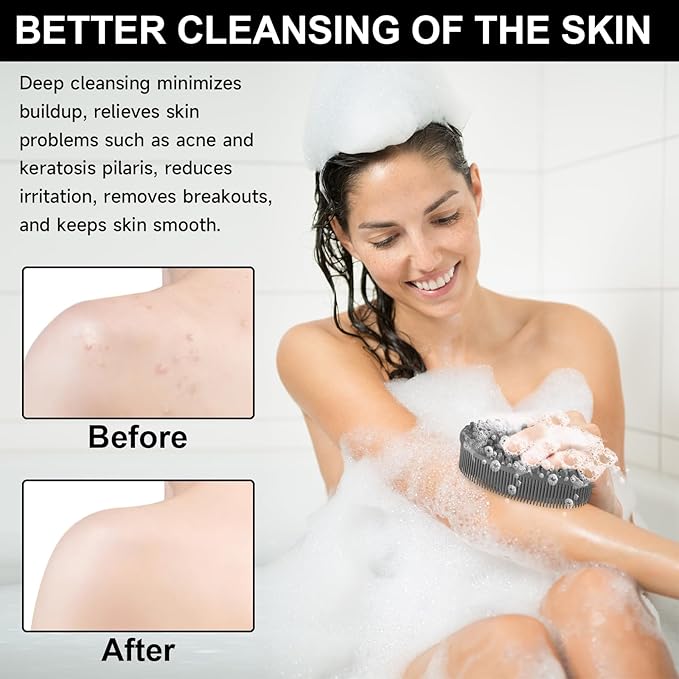 - 2 in 1 Silicone Body Scrubber: One side is a soft, long-bristled brush surface that makes it easy for you to clean all parts of your body. The other side has a scrubbing surface that helps you massage your head and skin joints. 4.7" x 2.8" x 1.37", It is the best choice for bathing and cleaning.