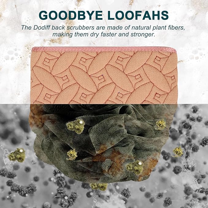 - 【Goodbye Loofahs】Gone are the days of annoying loofahs! The Dodiff back scrubbers are made of natural plant fibers, making them dry faster and stronger. They maintain their shape and roughness even after prolonged use!