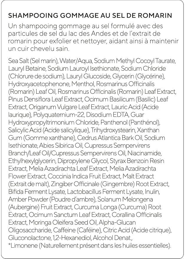 - NOURISHING INGREDIENTS: Contains Andes Lake Salt, Rosemary Essential Oil, Rosemary Decoction Extract, Lactic Acid Bacteria, Caffeine for comprehensive scalp and hair care.