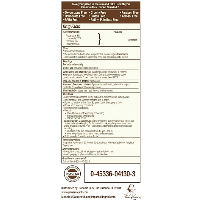 - MULTI-ACTION FORMULA: Panama Jack continuous sunscreen spray SPF 30 delicately combines antioxidants with moisturizing oils and a tropical fragrance in an oxybenzone and octinoxate free, broad spectrum UVA/UVB formula
