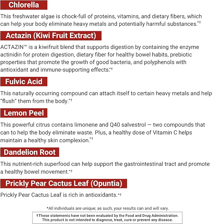- SUPPORT LIVER AND DIGESTION: Chlorella, prickly pear cactus leaf, and Actazin kiwi fruit extract all help support healthy liver and digestion functions, promoting a cleaner, healthier gut. Actazin's prebiotic fibers support nutrient absorption, while dandelion root aids in promoting healthy digestion and gastric emptying.*