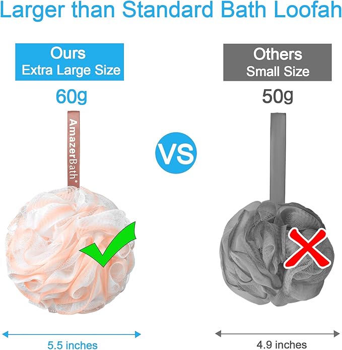 - Nice foaming effect: The AmazerBath loofah sponge has a dense, fluffy mesh that allows you to create a rich and luxurious lather with just a small amount of body wash or soap. (Using AmazerBath loofa can save you 20% of the shower gel)