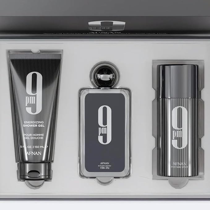 Afnan 9 Pm 3 Piece Set for Men, (3.4 Oz De Parfum Eau De Parfum Spray + 5.0 Oz Shower Gel + 5.0 Oz Perfume Deodorant)