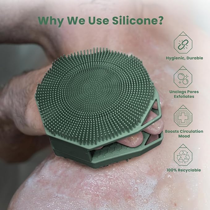 iTokGok® Premium 2-in-1 Silver-Infused Silicone Body Scrubber for Men, Double-Sided Design Body Brush Silicone Body Scrubber Exfoliating Body Brushes for All Skin, Lathers Well - Midnight Green