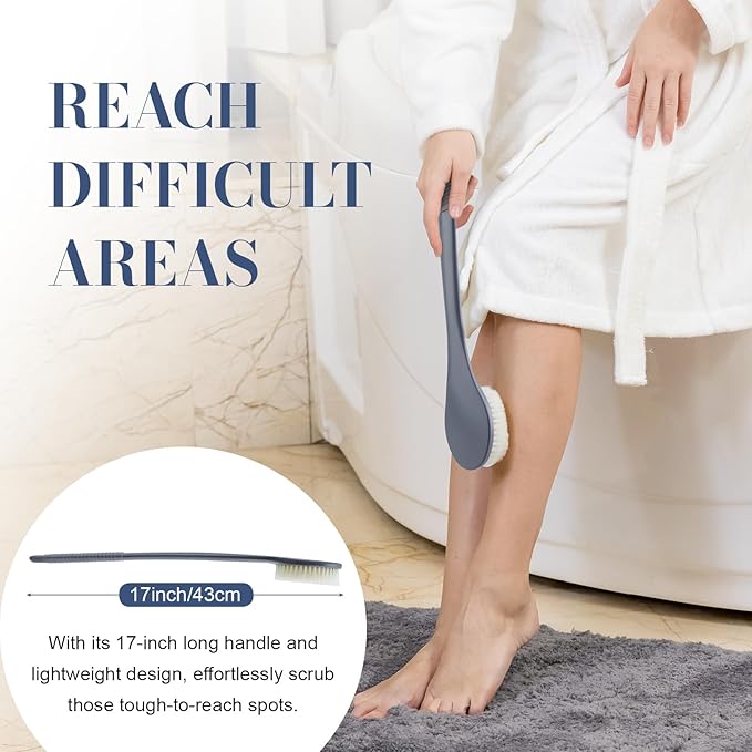 - EXTENED LENGTH OF REACH: To cater to its multi-functional role as a back brush for showering, we've upgraded the handle length to 17 inches, allowing you to effortlessly cover hard-to-reach areas like your back, lower legs, and feet without bending over. This feature proves particularly valuable for individuals with limited shoulder mobility or difficulty in bending their waist. Additionally, its slight curvature enhances ease of use with every stroke.