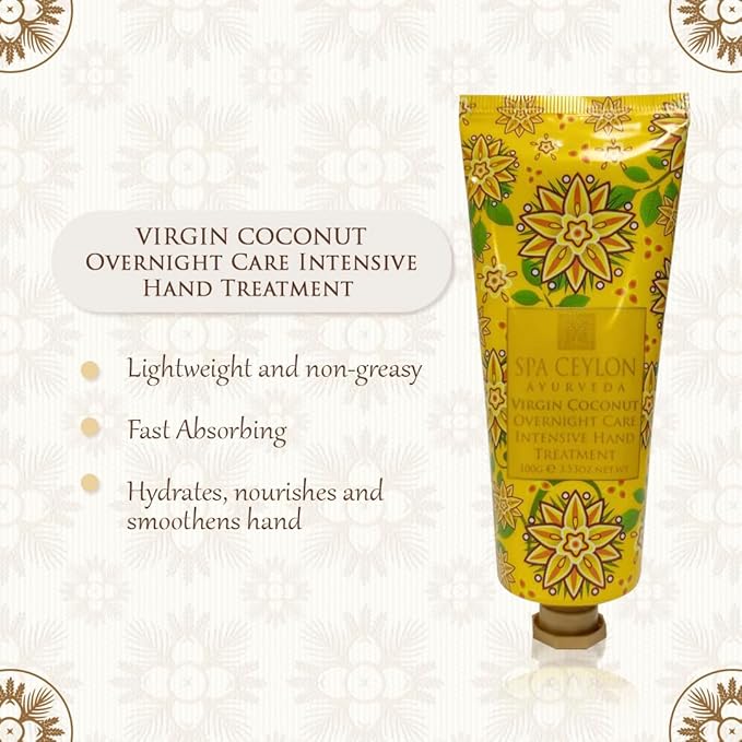 - Pure Coconut Overnight Treatment: Enriched with pure Virgin Coconut Oil, cold-pressed from hand-picked coconuts in lush tropical gardens of Ceylon, this intensive hand treatment is designed to provide deep nourishment and repair.