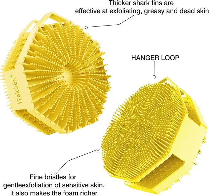 - Dual-sided Design:iTokGok Silicone Body Scrubber features two sides - one side with fine bristles for gentle of All skin and Lathers Well, and the other side with Scrubbing fins for exfoliation and thorough cleansing.