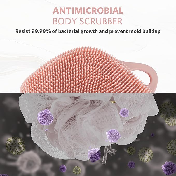 - Hygienic Silicone Body Scrubber: The body scrubber is made from 100% food-grade silicone and is infused with silver and zinc ions. It's more hygienic, comfortable and durable than loofahs or brushes made from other materials, ensuring a healthy and long-lasting cleaning experience