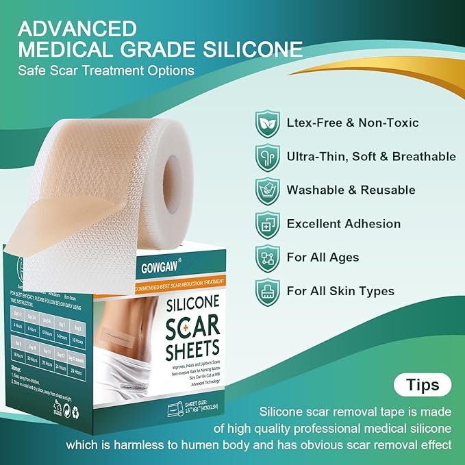- š¦ Medical-Grade Silicone Tape: Our Silicone Scar Tape is made with 100% soft hospital medical-grade soft silicone. It's non-irritating and easily applied and removed, provides pain-free removal and reposition.