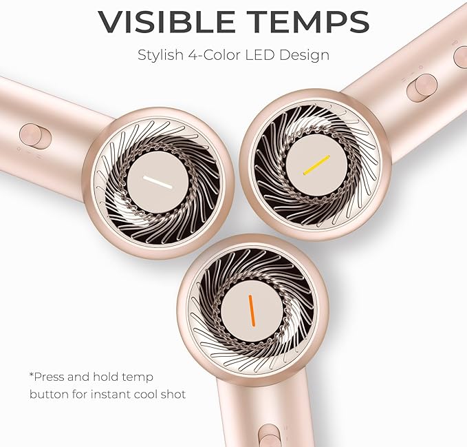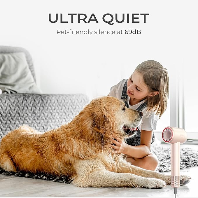 - QUIET & PERSONALIZED: Ultra quiet at 69dB, our hair blow dryer ensures a pet-friendly low noise experience. With 2-speed options and 4 temperature settings that correspond to color-coded indicators, you can easily personalize your desired look!