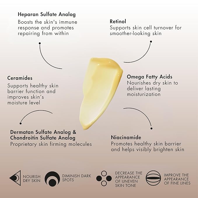 - 0.5% Retinol, HSA (Heparan Sulfate Analog), DSA (Dermatan Sulfate Analog) and CSA (Chondroitin Sulfate Analog) work together to efficiently improve skin tone, texture, and dark spots
