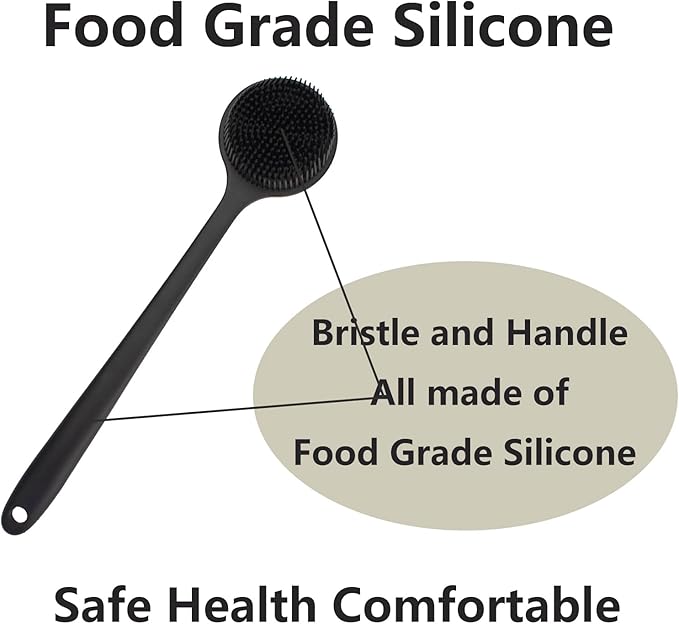 - Food Grade Silicone : Our silicone back scrubber are made of premium food grade silicone. Silicone is a soft and safe material that can help exfoliate your skin. Rubbing the bristles into your skin stimulates blood circulation and can reduce cellulite in problem areas. This silicone shower brush is friendly to men women and kids.