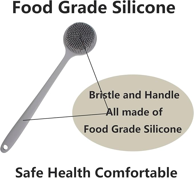 - Food Grade Silicone : Our silicone back scrubber are made of premium food grade silicone. Silicone is a soft and safe material that can help exfoliate your skin. Rubbing the bristles into your skin stimulates blood circulation and can reduce cellulite in problem areas. This silicone shower brush is friendly to men women and kids.