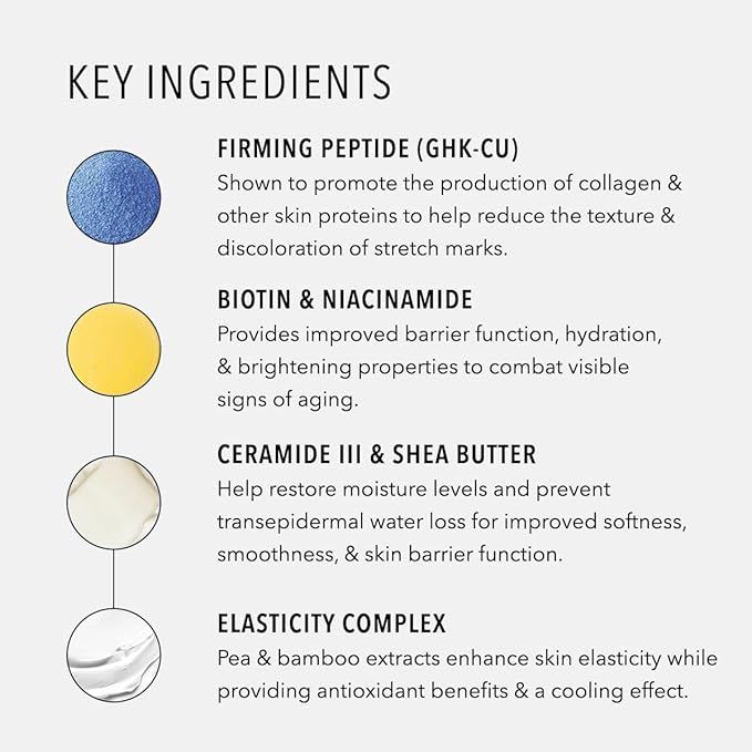 - A potent mix of active ingredients gives skin a dewy sheen and a firm, youthful look. Firming peptide GHK-Cu, promotes collagen production and other skin proteins to help reduce the texture and discoloration of stretch marks