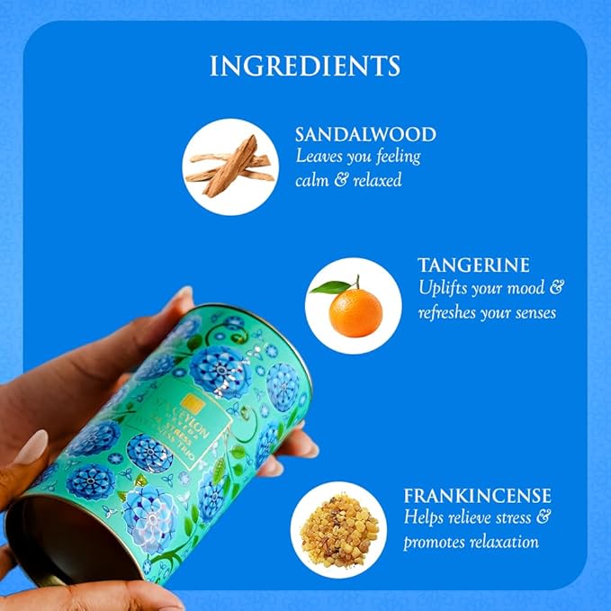 - Deep Calming Blend - Frankincense, known for its deep calming properties, helps still the mind and ease stress while Uplifting Tangerine and Key Lime promote mental clarity, and soothing Sandalwood harmonizes and balances the chakras for overall well-being.