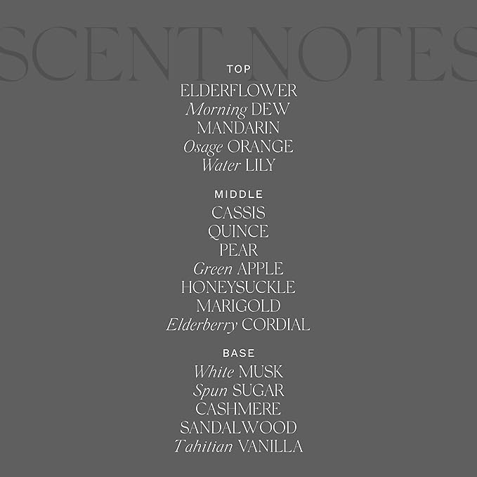 - Ethereal Spring: Glistening elderflower is enhanced by notes of pear, quince and osage orange, freshly picked off the branch; a translucent base of spun sugar and cashmere lends a lingering elegance