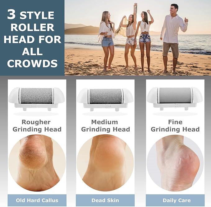 - WATERPROOF: This foot pedicure tool is IPX7 waterproof. You can wash the grinding head of the foot file safely after using it with no worries. 3 different heads for different foot conditions.