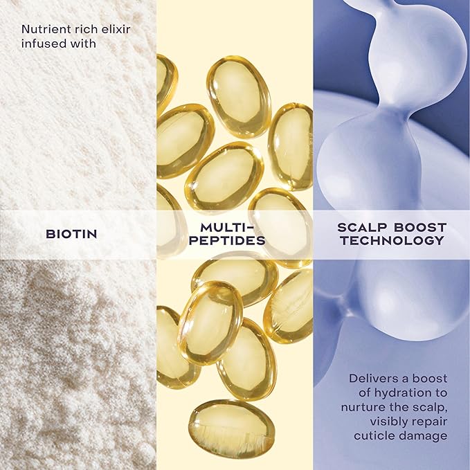- FEED YOUR SCALP: Our nutrient rich elixir is infused with Biotin, Multi-peptides and ScalpBoost technology to visibly repair damage, reduce hair fall due to breakage and revitalize strands.