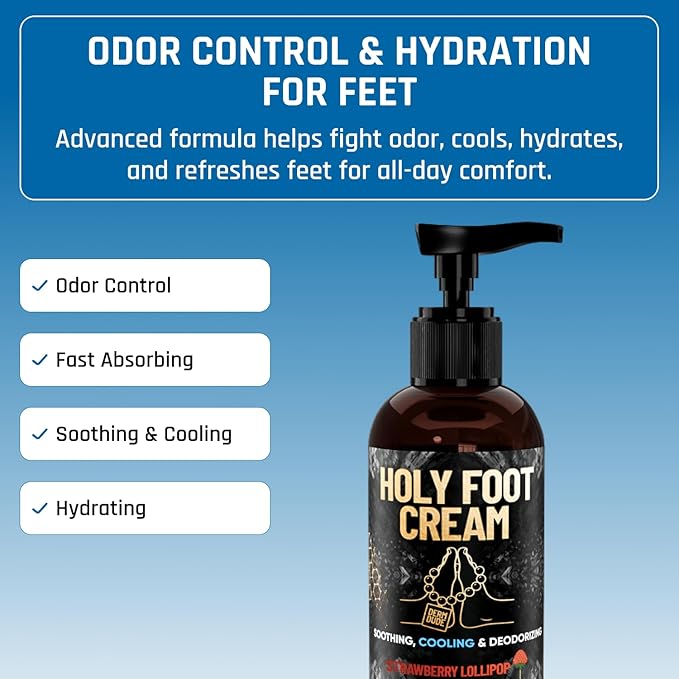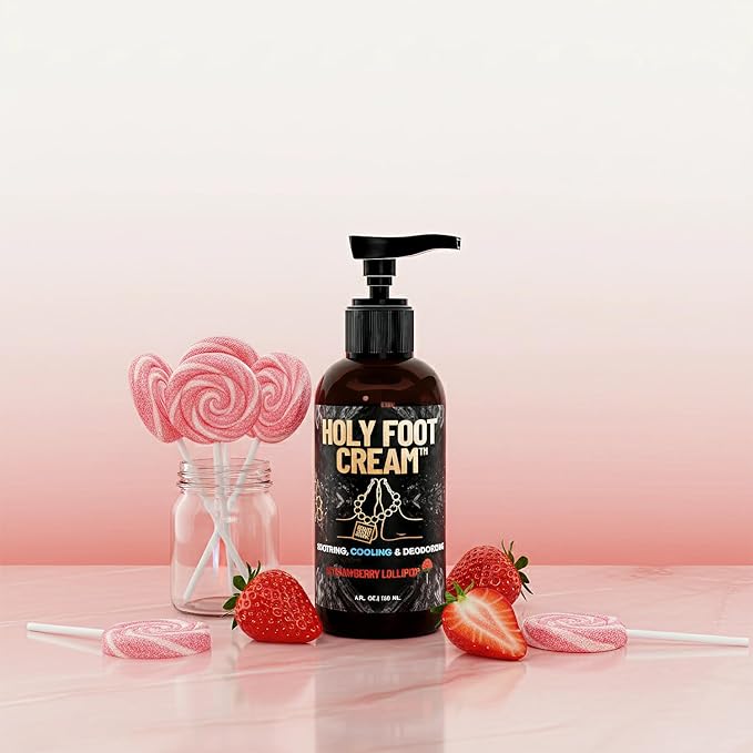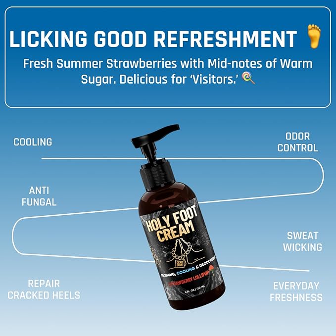 Derm Dude Holy Foot Cream for Dry Cracked Heels and Feet | Moisturizing Lotion Formulated w/All-Natural DeoPlex for Odor Control & Arrowroot for Deep Hydration - Strawberry Lollipop Scent 4oz (1pack)