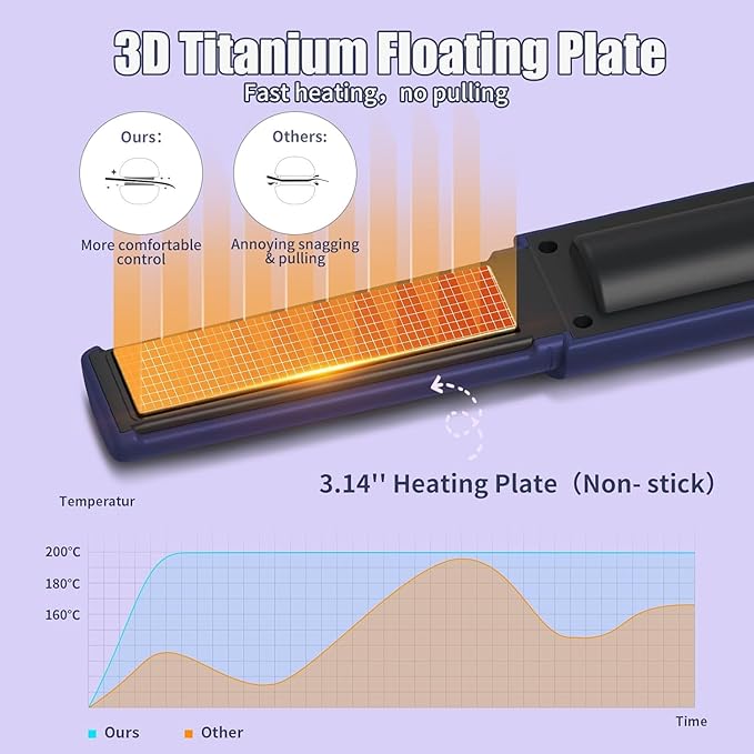- 【3 Adjustable Temp & Fasting Heating】170°C (338°F), 190°C (370°F), 210°C (410°F). Titanium alloy material splint has excellent heating, warming in 2 seconds, reaching styling temperature in 50 seconds, and protected by a 10-minute auto shut-off, the included heat-resistant protective cover allows for immediate storage after use without waiting for cooling, saving time and effectively avoiding accidental burns or damage to personal items.So you can style anytime without the wait.