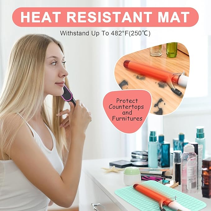 - SAFETY PROTECTION: This silicone heat resistant mat for hair tools prevents heat damage to countertops and furniture from curling irons, flat irons, hair straighteners, hair curling wand, hot air brushes, hair dryers and other hot tool appliances