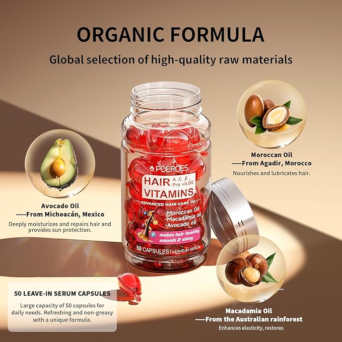 Hair Oil 50 Capsules - Hair Vitamins A C E Pro B5 - Hair Treatment Serum - Hair Serum for Frizzy and Damaged Hair - Argan & Avocado Oil - Leave in Conditioner for Women & Men