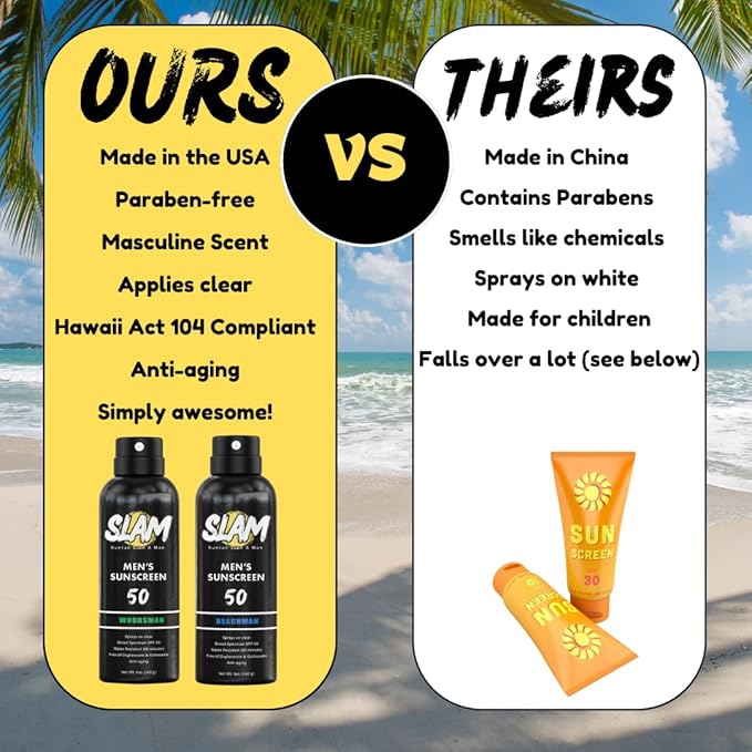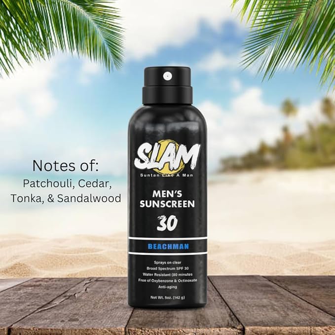- Manly Cedarwood Scented Sunscreen Spray: Embrace the rugged aroma of cedarwood with this men’s sunscreen spray. Slam Lotion BeachMan SPF 30 sun screen spray keeps you protected and smelling great on every outdoor adventure. The perfect size sunscreen spray.