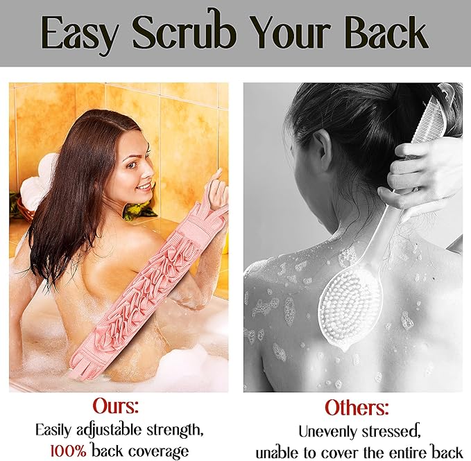 - 【Exfoliating Scrubber Set】This pink set includes 1 exfoliating scrub mitt and 1 long bath scrub washcloth. The 2-in-1 mitt & washcloth are made of green and eco-friendly plant fiber sponge, one side is rough scrub surface suitable for exfoliating dead skin, and the other side is loofah mesh yarn for easy and long-lasting lather in the shower.