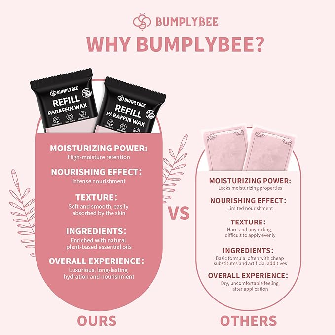 - Skin Care & Mild Properties - Designed for ease and suitable for sensitive skin, BUMPLYBEE parafin wax enhances skin texture and visage, crafted for simplicity and compatible with delicate skin; Ideal for paraffin wax for hands, provides deep hydration, addressing dryness and roughness for lasting softness; Dive into a hydrating bath that leaves your skin soft and radiant; Each session with our paraffin wax block is crafted to gently and effectively enhance skin care routines
