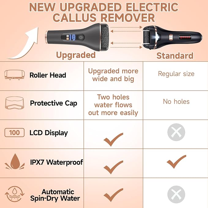 - 【More Wide ,More Big Grinding Heads & 3 Replace Roller Heads】 ━ The electronic callus remover of upgraded grinding rollers removes dead skin in a wider and larger area, thus effectively removing the calluses, and cracked heel dead skin.In addition,our callous removers for feet has 3 different quartz sand grinding heads. You can choose suitable grinding head according to the skin to care,make your feet restore the delicate and smooth skin.