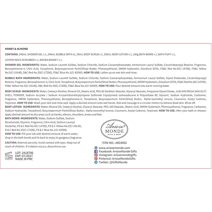 - SUITABLE FOR ANY OCCASION: Honey Almond Spa Gift Basket is the perfect gift for any occasion. Whether you're celebrating a birthday, anniversary, or simply want to treat yourself, this luxurious set is sure to impress