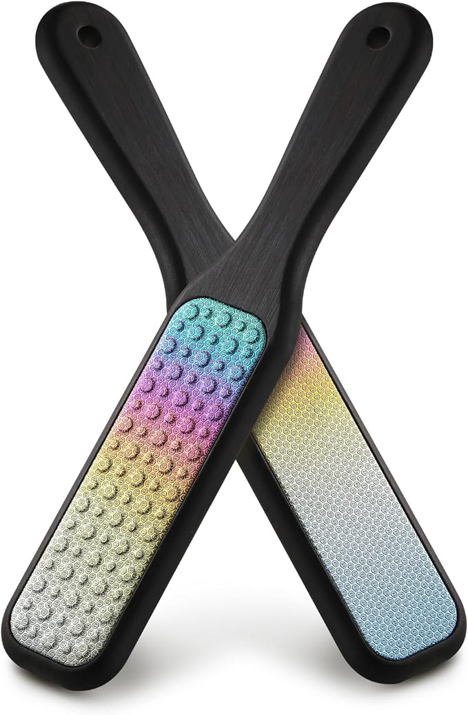 - PROFESSIONAL STAINLESS STEEL MATERIALS - Both sides of the foot files callus remover are made of premium stainless steel and endurable material, which is stronger than similar products made of glass. Easy to clean and reuse, won't rust or lose pedicure texture, safe and painless to remove dead skin from feet.