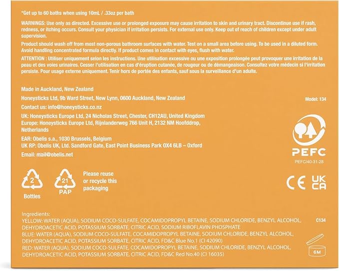 - 100% FUN, 0% NASTIES: Honeysticks Non Toxic Bubble Bath uses a gentle, plant-based recipe that is rigorously safety tested for baby / toddler / kids aged 12 months plus. It is free from SLS, phthalates, parabens, and fragrances. Vibrant color is added using cosmetic and food grade colorings. Made in New Zealand.