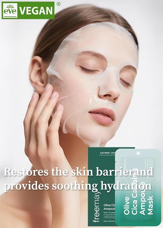 freemay Olive Cica Calming Ampoule Mask, Helps Support Skin Barrier & Calms Look of Redness, Vegan Sheet Mask for Sensitive Dry Acne-Prone Skin, 10 Sheets