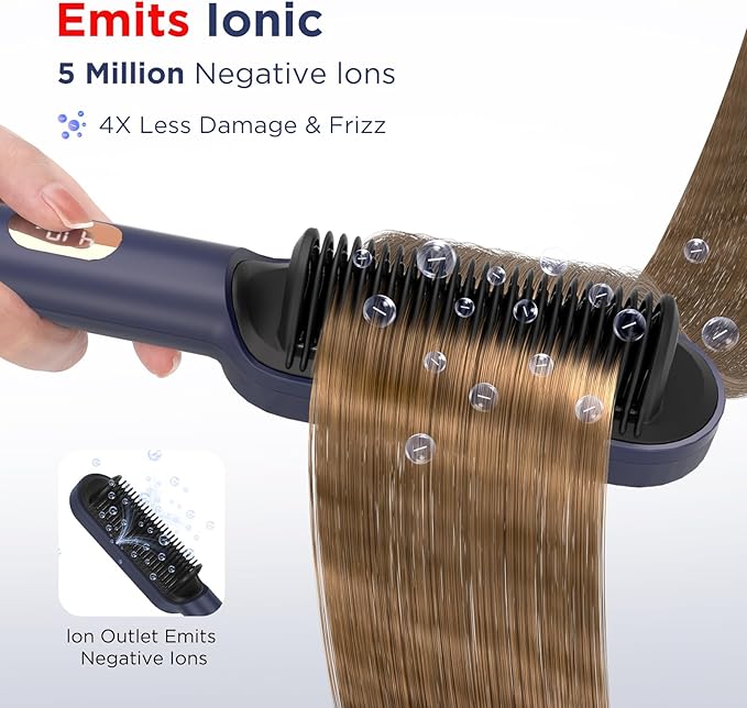 - Negative Ionic Hair Care - This hair straightener comb releases millions of negative ions simultaneously to deeply penetrate your hair for lasting protection and nourish the hair from the inside out, activating water molecules to repair hair scales, keeping your hair frizz-free and shiny. Tip: The negative ion generator may make a slight NOISE while working. This is normal, so no worries