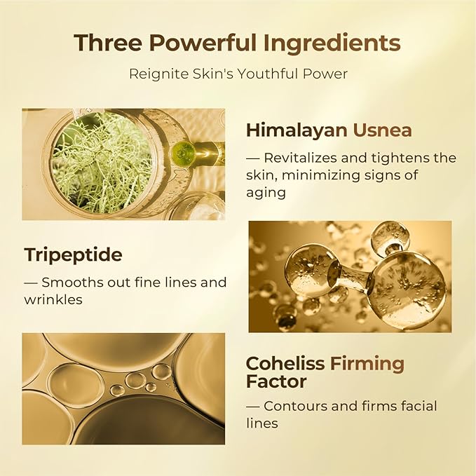 - ANTI-AGING KEY INGREDIENTS: Meet Himalayan Usnea Extract – Tibet’s skin-repair secret that stimulates skin thickness + calms redness. 3X Peptide delivers fast line-smoothing, plumpness, and 24H crease defense. COHELISS tightens sagging skin with +33% collagen lift + acts as a pollution armor.