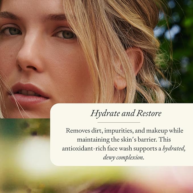 - HYDRATE & RESTORE - Removes dirt, impurities and makeup while maintaining skin’s barrier. This antioxidant-rich face wash supports a hydrated, dewy complexion.