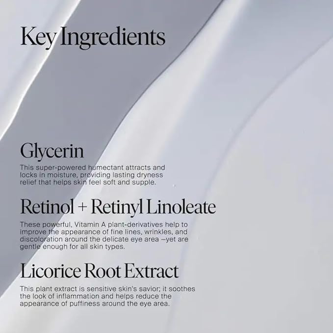 - Key Ingredients - Glycerin is a key ingredient in the formulation of this undereye serum, a super-powered humectant that attracts and locks in moisture for lasting dryness relief that helps skin feel soft and supple. Plant-based vitamin A derivatives help to improve the appearance of fine lines, wrinkles and discoloration around the delicate eye area. Gentle enough for all skin types.