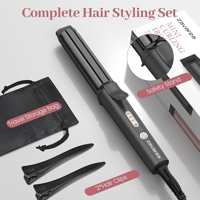 Zavarea Curling Iron for Short Hair, Mini Hair Curler with 1 Inch Ceramic Barrel, 3 Adjustable Temp, Portable Design, Instant Heating, Dual Voltage for Travel, Auto Shut-Off, Includes Storage Bag