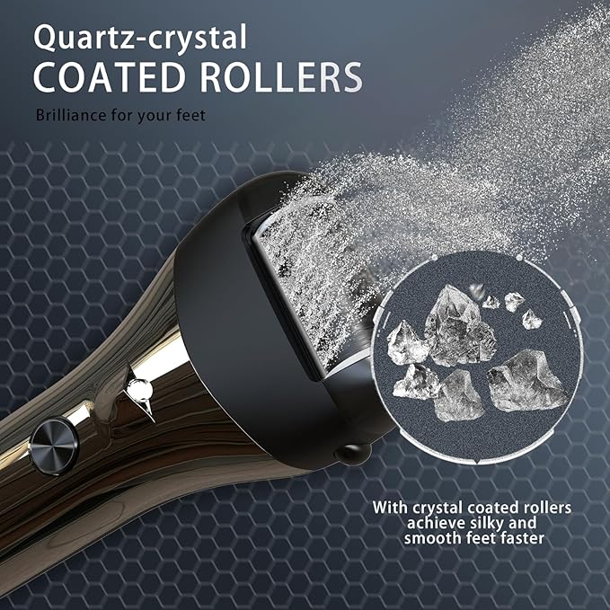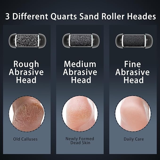 - 【Upgraded Version -- Powerful And Safe】Upgraded version of electric foot file callus remover is equipped with 3 enlarged quartz crystal removable roller head, quartz roller head wider, larger area to remove dead skin, 3 speeds (1400x/min,1700x/min and 2000x/min) Correspond to the roughness required to remove the calluses on the feet; with LED lights, automatically turn on while the foot grinder began working, help you see more clear and remove the deadskin around all angles.Grinding faster and cleaner, so that your feet to restore delicate and smooth skin.